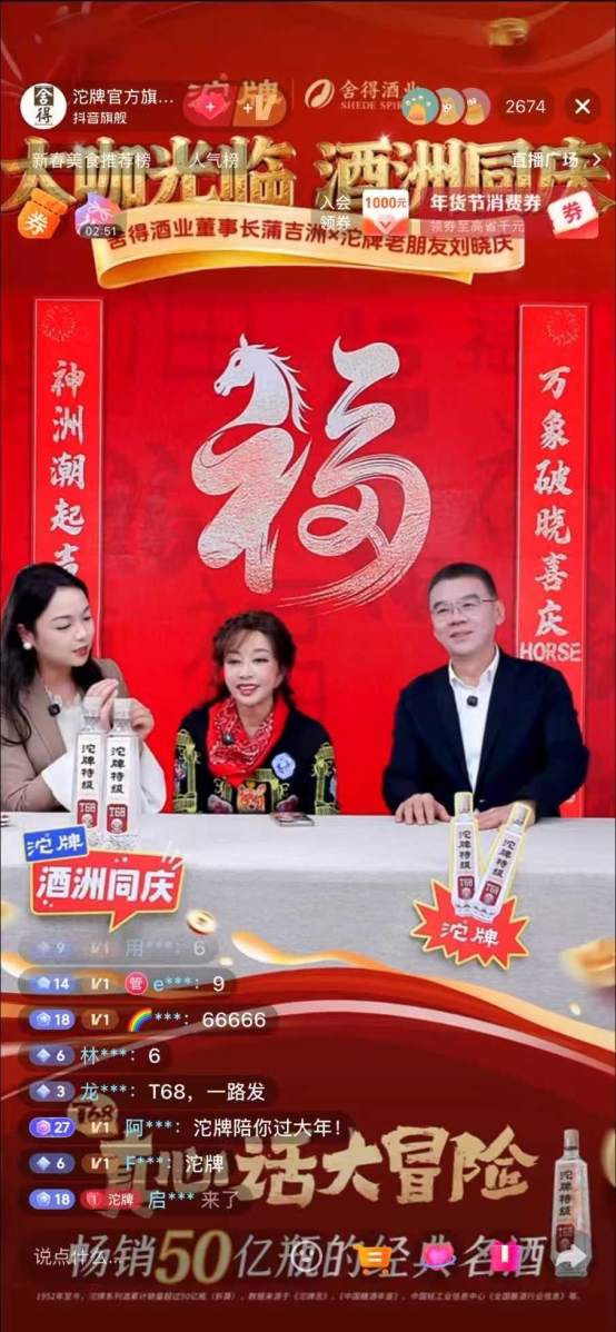 1月31日,刘晓庆现身沱牌抖音直播间,开启“酒洲同庆”直播;